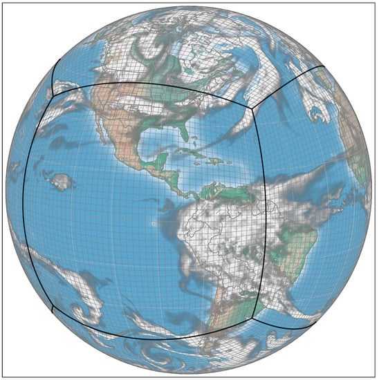 The native Finite Volume Cubed Sphere (FV3) gnomonic grid at 2° resolution for the GFSv16 weather model (image courtesy of Dusan Jovic, NOAA). Figure adapted from Campbell et al., 2022 [10].