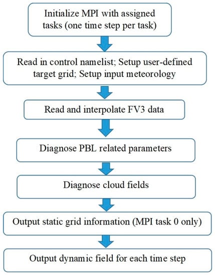 In general, NACC defines the computational domain for CMAQ, subsequently extracts meteorological model output and interpolates both horizontally and vertically on the computational domain that is prescribed, and processes all required meteorological fields for CMAQ. Meteorological fields such as atmospheric temperature, pressure, humidity, and winds are acquired directly from the meteorological model (i.e., “passed through”), while NACC also uses the available meteorological fields to compute additional fields that are required by the CMAQ but are not part of the meteorological model’s output stream (e.g., the Jacobian used for model coordinate transformations). The NACC code is parallelized using MPI and time-splitting techniques, where one time step is processed with each MPI task, which results in much improved computational efficiency. NACC outputs both static and dynamic files in I/O API format that contain geospatial and meteorological information used by CMAQ (Figure 3).