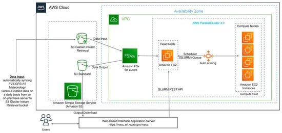 GFSv16 meteorology global-gridded data files as input data are uploaded from an on-premises NOAA server to an Amazon® S3 Glacier Instant Retrieval (IR) bucket daily (Figure 4). When a user submits a processing request through the NACC-Cloud web interface, input data is synced automatically over to the Amazon® FSx mounted in the cluster’s head node and accessible from all compute nodes. Once the processing request is finished, the application’s output data files are synchronized over to the S3 bucket, from which the end user can download the results. Output data files are deleted from S3 after two weeks.