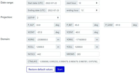 Upon authentication, users are able to access a form on the web app where they can specify NACC run parameters for CMAQ applications (Figure 5). Users can specify the time period, spatial (xyz) domains, and map projection. The map projection options are currently limited to Lambert conformal (GDTYP = 2) and polar stereographic (GDTYP = 6) for CMAQ applications, but they may be expanded in the future. The integer identifiers for the projections refer to those in I/O API (https://www.cmascenter.org/ioapi/documentation/all_versions/html/GRIDS.html, accessed on 16 June 2023), and this is documented on the form page below the form itself.