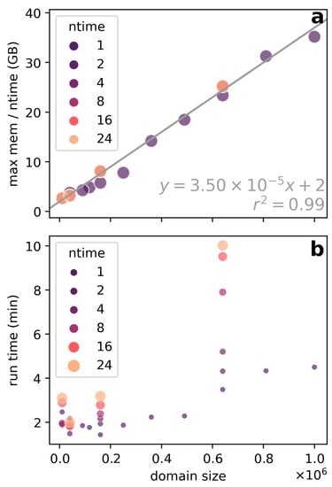 As described in Section 2.2, NACC has MPI-based parallelism, where each time (hour) runs in a separate MPI task. We ran a series of experiments with different time counts and domain sizes to examine the scalability of NACC-Cloud. We found that the maximum job memory, diagnosed using Slurm tools, scales linearly with domain size (Figure 6a). We use this linear relationship to estimate the memory needs for Slurm jobs and request the resources from the scheduler accordingly. The run time scaling (Figure 6b) is more variable. The “warmth” of the EC2 On-Demand instance/cluster when the job starts introduces variability. In general, the increases in run time are roughly linear with domain size and number of times. These results indicate that NACC scales well.
