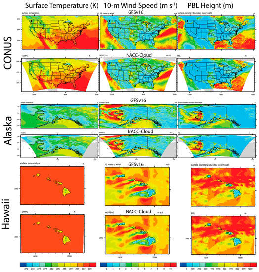 Comparison of input GFSv16 meteorology (i.e., surface temperature, 10-m wind speed, and planetary boundary layer height at ~13 × 13 km) and NACC-Cloud interpolated results (12 × 12 km) for example CMAQ LCC projection domains centered on the contiguous U.S. (top rows), Alaska (middle rows), and Hawaii (bottom rows). The time period shown is for 22 July 2022 at 1200 UTC.