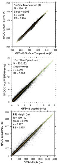 Results show an excellent agreement in hourly NACC-Cloud outputs and GFSv16 inputs for surface temperature, 10-m wind speed, and planetary boundary layer height, with a slope, Pearson correlation coefficient (r), and coefficient of determination (R2) very close to 1, and the calculated x-y regression line nearly overlapping the 1:1 line (Figure 8). Previous work also showed excellent agreement in the vertical structure of the GFSv16 input and NACC output 3D meteorological variables also necessary for driving CMAQ applications [10]. These results provide the utmost confidence in using the NACC-Cloud system for user GFS-driven CMAQ applications and facilitate a myriad of new research and science questions when coupling NOAA’s GFSv16 to CMAQ for any regional domain globally.