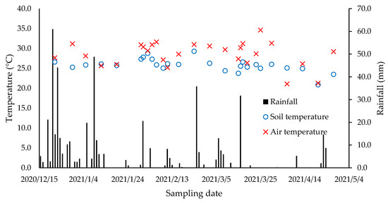 Climatic variables such as precipitation and the minimum, average, and maximum air temperature were collected from an agrometeorological station installed near the experimental area (approximately 700 m). At the time of sampling, the soil temperature was evaluated using digital thermometers.
