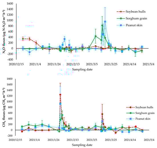 Nitrous oxide fluxes (μg N-N2O m−2 h−1) and methane fluxes (μg CH4 m−2 h−1) emitted from the excreta of Nellore bulls backgrounded in a Marandu grass pasture, supplemented with 0.3% CP of peanut skin, 0.3% CP of soybean hull, and 0.3% CP of sorghum grain, in the growing season period from the second half of December 2020 to the end of April 2021.