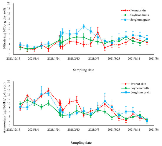 To quantify NO3− and NH4+, 10 g of fresh soil was mixed at 50 mL 2 M KCl, stirred for 40 min at 240 rpm (rotations per minute), and filtered. The filtered solution was frozen until the N-nitrate (plus N-nitrite) and N-ammonium were determined. To determine the ammonium (NH4+) and nitrate (NO3−), the Berthelot reaction [41] and reduction by vanadium chloride-III [42] were used, respectively.