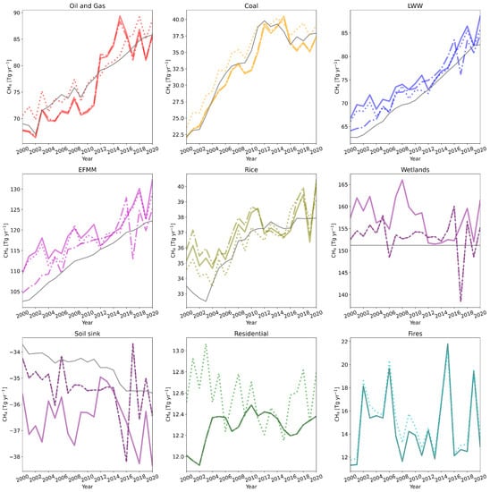 The global trend of oil and gas emissions in GAINS according to our COMBO_2 results are consistent with the observed trends, as the results now suggest that oil and gas emissions are overestimated. However, the magnitude of oil and gas emissions in GAINS is larger compared to EDGAR v6.0 or the ORIG posterior. The global increasing trends in agricultural (including EFMM, LWW, and rice) and fossil (including coal and oil and gas) emissions are consistent with other bottom-up estimates by Stavert et al. [61], although different prior emissions were used. However, the total magnitude of fossil emissions in bottom-up estimates is larger than the top-down estimates in Stavert et al. [61], but in this study, the estimated global fossil emissions are, on average, 0.8–1.43 TgCH yr smaller. The estimated agricultural emissions in this study are higher than prior emissions, contradicting the results of Stavert et al. [61].