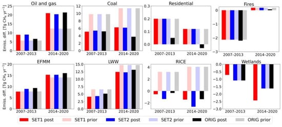 The inversions performed in this study were able to decrease the global coal emissions compared to priors throughout the years (on average 0.8–4.7 TgCH yr). However, the inversions were unable to decrease global oil and gas emissions, which were 5.88 TgCH yr higher than priors between 2014 and 2020. LWW and EFMM emissions were estimated to be larger tan priors, as suggested by the TM5 results. The inversions were unable to reduce fossil-based emissions enough, nor could they increase the agricultural emissions enough after 2012, but this can be explained by the inversion model’s ability when the prior fluxes used are estimated wrongly, e.g., in magnitude or in spatial distribution. The TM5 results indicate that wetland CH emissions should be optimized separately, as previously carried out by (e.g., [30,31]), and not together with agricultural emissions, as was carried out in this study. Furthermore, the TM5 results indicate that the contributions from biogenic sources to recent CH trends need to be larger, which is consistent with Basu et al. [62]. In this study, we assimilated only CH in the inversion, but there are studies that suggest it could be beneficial to simultaneously assimilate the CH and CH [62].