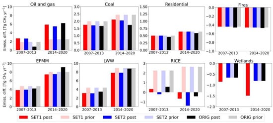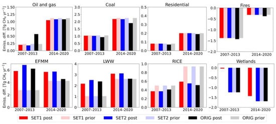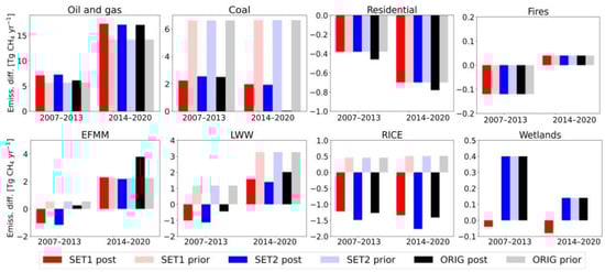 The inversions differ in the categorization of the optimized fluxes (Table 3). For each category, one flux-scaling factor is applied per optimized region (see Section 2.1). In ORIG, the optimized category 1 (categ1) includes all anthropogenic sources, i.e., coal, oil, and gas, EFMM, LWW, rice, and residential, as well as biomass burning. Category 2 (categ2) includes wetlands and soil sinks. This division was used in, e.g., Saunois et al. [1]. This kind of division does not consider the differences in isotopic signatures, and the CH budgets can be better resolved when emissions with similar isotopic signatures are optimized in the same category. Therefore, we wanted to optimize emissions together with similar isotopic signatures, so SET1 and SET2 inversions were performed. In SET1, categ1 includes coal and oil and gas, and categ2 includes EFMM, LWW, rice, wetlands, and soil sinks. In SET2, categ1 includes coal and oil and gas, and categ2 includes EFMM, LWW, and rice. In all inversions, the emission sources that are not included in categ1 or categ2 are taken as priors and not optimized.