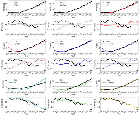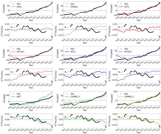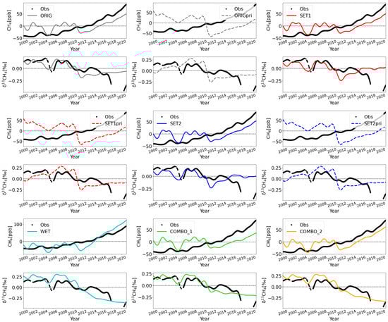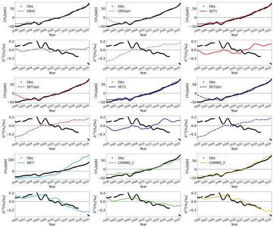 At SPO, the modeled and observed trends in the CH anomaly are similar, except for WET. The priors are also different before 2003 (Figure 9). The observed trend in CH is similar to the observations in WET and COMBO_2 (Figure 9). The trend in COMBO_1 is decreasing but still weaker than the observations. Other simulations show an increasing trend in CH, which is opposite to the observations.