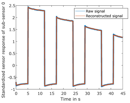 Raw signal in blue together with the reconstructed signal in red from features extracted from adaptive linear approximation for sub-sensor 0. Only a section (0 s–45 s) of one temperature cycle is illustrated for better visibility, and only the signal of sub-sensor 0 is shown.