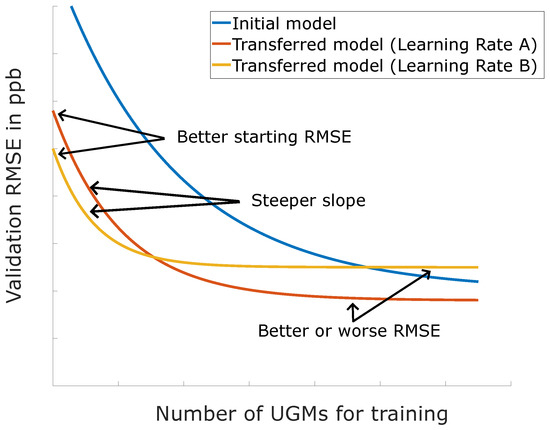 The idea is illustrated in Figure 6. While the blue line resembles a model trained from scratch, the other two show the expected benefit when adjusting (retraining) an already working model to a new sensor. The modified model needs much fewer UGMs to get to a relatively low RMSE, and the improvement is much steeper. The hyperparameter to tune transfer learning is typically the learning rate. All hyperparameters of the TCOCNN are the same as before, and only the initial learning rate is set to the learning rate typically reached halfway through the training process. Of course, it would also be possible to tune this process with the help of Bayesian optimization to achieve even better results. However, this was not tested in this study, and the optimal value obtained in other studies is used [29].