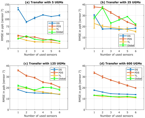 To emphasize the benefit of transfer learning compared to global modeling, Figure 10 illustrates the side-by-side comparison of both approaches over the different number of transfer UGMs regarding an initial model built with one sensor, and one where the initial model was constructed with all six sensors. The most important part is in relation to the five transfer UGMs. While the benefit of transfer learning compared to global model building is not apparent when the initial model is built with only one sensor, the effect can be seen when six sensors are used. Figure 10b indicates that transfer learning shows its full potential when trained with more sensors. While global model building achieves an RMSE of only 24.9 ppb, transfer learning can get as low as 17.7 ppb. This is in accordance with the theory that a model trained simultaneously with the initial and transfer data cannot adapt to the new sensor like the specifically tailored model obtained by transfer learning.