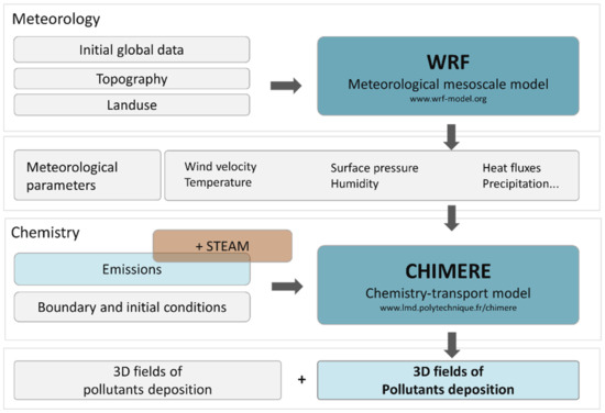 The WRF-CHIMERE modelling system was applied for this study. This system combines the capabilities of the Weather Research and Forecasting (WRF) model [28] that provides meteorological data for the CHIMERE air quality model that computes ambient pollutant concentrations [29,30,31]. The modelling system components are detailed in Figure 1. Hourly simulations were performed using a 10 × 10 km2 horizontal resolution for each simulated year over a European domain. The relevant model options were as follows: LMDz4_INCA boundary conditions for gaseous and particle species; a reduced MELCHIOR chemical mechanism with chemically active aerosols; and the second-order Van Leer vertical advection scheme. For a more accurate quantification of future changes due to climate change, WRF was run for a representative meteorological year for the baseline and the future scenario driven by the Max Planck Institute Earth System Model (MPI-ESM). Additionally, the model was run with two nested domains, spectral nudging, SST updates every six hours and the following physics options: WSM 6-class graupel scheme microphysics, RRTMG longwave and shortwave radiation, the Monin–Obukhov similarity surface-layer scheme, Noah Land Surface Model, YSU boundary-layer scheme and Grell–Devenyi ensemble cumulus option. Both CHIMERE and WRF were run with the default output options, providing the full range of pollutants and 3D meteorological variables, respectively.