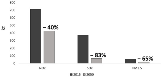 The emissions data used for baseline was the 2015 EMEP emissions inventory, which covers the entirety of Europe at a horizontal resolution of 0.1 by 0.1 degrees, with yearly accumulated values by activity sector for CO, NH3, NMVOC, NOx, SOx, PM10 and PM2.5. For the shipping sector, which is the focus of this study, emission simulations for the baseline and 2050 projections were performed with the Ship Traffic Emission Assessment Model (STEAM). The STEAM model works in three main stages, the first is data assimilation where the AIS activity data from ships is processed, a ship database is built and the routes for the ships are generated. Second, the vessel state and characteristics are estimated from the onboard equipment, technical properties of the ship, engine characteristics, among other technical details. And third, the final emissions from each ship are calculated from their fuel consumption, engine load and emissions factors. For more detail on the STEAM model and examples please refer to [22,32,33,34]. Figure 2 shows the projected emissions reduction in 2050 of the main primary pollutants addressed in this study (NOx, SOx and PM2.5).