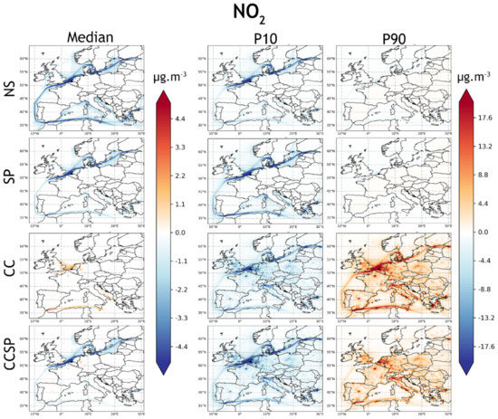 When examining the isolated difference due to climate change alone (scenario CC), there is a median increase in NO2 concentrations in locations which were already hotspots for this pollutant, mainly large urban areas and regions that have high shipping activity, with an increase of +3 to +4 µg·m−3. For the P10 and P90 values, a larger range of differences are noted, particularly the road transport network throughout Europe, as well as a clear view of the shipping routes (largest variation registered for P90 with values of approximately 20 µg·m−3). Finally, in the CCSP scenario, which combines the effects of climate change and shipping projections, the effects of climate change over the land areas still remain, but the estimated reduction in NO2 concentrations from the shipping sector in the north of Europe can offset the expected increase from climate change, achieving a median reduction of 2 to 3 µg·m−3. However, in the Mediterranean, the reduction in shipping emissions in the future scenario leads to a low reduction in NO2 concentrations attributable to shipping, which is not sufficient to counteract the effect of climate change, leading to neglectable median differences in this region.