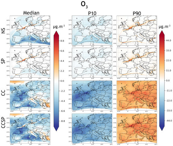 Median hourly difference for O3 (left), along with 10th (middle) and 90th (right) percentile differences during warm months for the four studied scenarios (NS—no shipping; SP—shipping projection; CC—only climate change; CCSP—climate change and shipping projection).