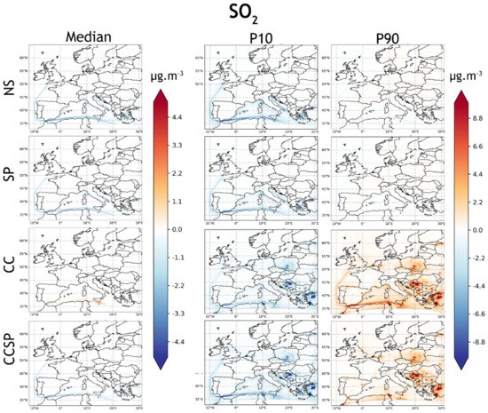 The SO2 median concentrations differences (Figure 5) for NS only show noticeable contributions of shipping activity in the Atlantic and Mediterranean, ranging from −3 µg·m−3 median differences to −10 µg·m−3 P10 differences. A SECA has been enforced in the North and Baltic Seas since 2005/2006; hence, removing shipping emissions from this area has little to no effect on the SO2 concentrations for the region. Considering the SP scenario, there is evidence showing that the implementation of the SECA in the Mediterranean (which should be in full effect in 2025) will replicate the effect of what has happened in Northern Europe, reducing the future contribution of the shipping sector by a value equivalent to the current contribution (3 to 4 µg·m−3).