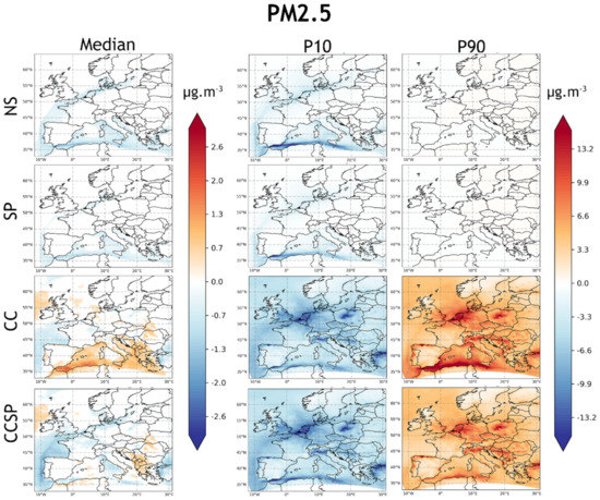 In the CC scenario, there is an expected increase in PM2.5 in the Mediterranean of approximately +1 µg·m−3 for most of the Mediterranean and up to +3 µg·m−3 for the Strait of Gibraltar, while most of the rest of Europe shows a very small decrease or negligible differences. Nonetheless, the differences can range from −14 µg·m−3 for P10 to over +15 µg·m−3 in P90. The CCSP scenario shows that the effects of the SECA to be enforced in the south will cancel out the increase projected for PM2.5, with a further decrease in PM2.5 concentrations in the Atlantic region, reaching median values of 2 to 3 µg·m−3. This suggests that the planned emissions control areas will be helpful in reducing or controlling PM2.5 concentrations where there is high shipping activity.
