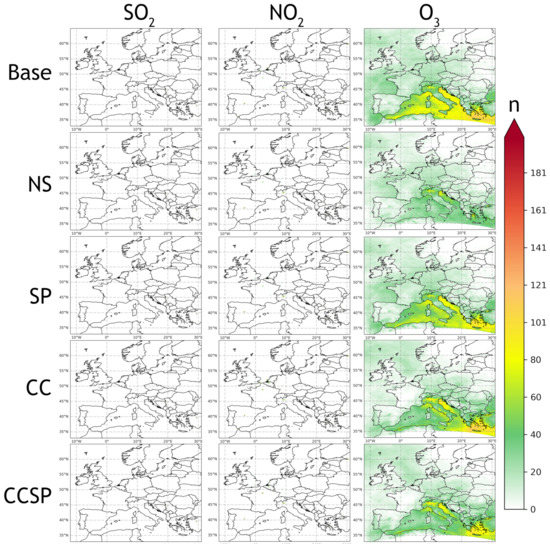 Number of exceedances of the EU air quality directive for SO2 (n hours above the limit value), NO2 (n hours above the limit value) and O3 (n days with daily 8 h maximum above the limit value) for the baseline and each scenario (Base—baseline scenario; NS—no shipping; SP—shipping projection; CC—only climate change; CCSP—climate change and shipping projection).