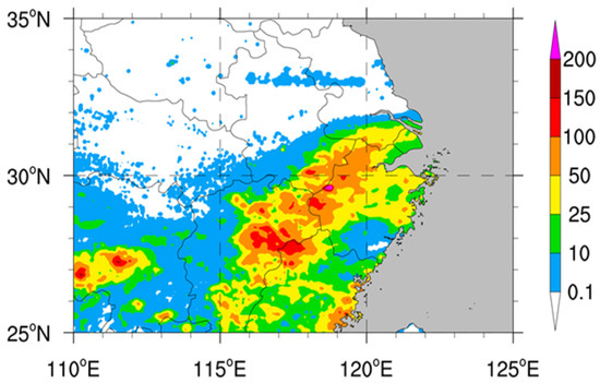 From 19 June 2018 18:00 UTC to 20 June 2018 18:00 UTC, a heavy precipitation event occurred in the middle and lower reaches of the Yangtze River in southeastern Anhui, eastern Jiangxi, northern Zhejiang and central Hunan under the influence of cyclones, shear lines and low-level jets. The distribution of 24 h real cumulative precipitation is shown in Figure 1. The main rain belt was in the area from northern Zhejiang to eastern Jiangxi, showing a northeast–southwest trend. In the east of Jiangxi, there was a large rainstorm center with a cumulative precipitation of more than 100 mm in 24 h. At the junction of Anhui and Zhejiang, there was heavy rainfall of more than 200 mm in local areas.