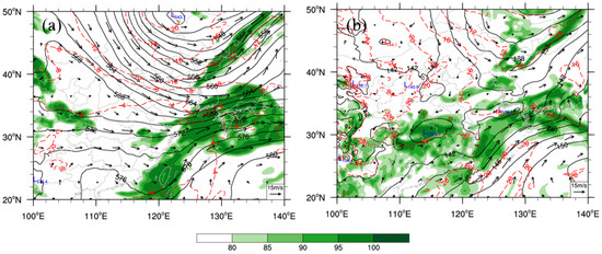 Weather situation of ERA5 reanalyzed data at 19 June 2018 12:00 UTC (the black solid lines are contours in dagpm; the red solid lines are isotherms in °C; the shading is relative humidity in percent): (a) 500 hPa; (b) 850 hPa.