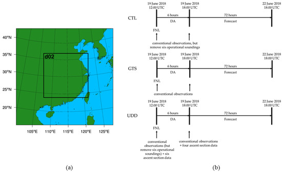 The experimental setup is shown in Figure 3b. The start time of all three experiments was 19 June 2018 12:00 UTC. The ascent and descent times of the balloon in the experiment were 19 June 2018 12:00 UTC and 19 June 2018 18:00 UTC, respectively. The CTL experiment assimilated the conventional observations but excluded the operational sounding data from six stations in Yichang, Wuhan, Anqing, Changsha, Nanchang and Ganzhou. The purpose of removing the operational soundings from these six stations was to serve as a control experiment. This allowed an overall assessment of the effects of assimilating the ascending and descending segments of the round-trip drifting soundings. The GTS experiment assimilated all the conventional observations. In other words, the GTS experiment added the operational sounding data of the six stations that were previously removed in the CTL experiment. The purpose of the GTS experiment was twofold. On the one hand, it was compared with the CTL experiment to demonstrate the effect of assimilating the operational sounding data; on the other hand, it was compared with the UDD experiment to study the improvements in the effect of assimilation of round-trip drifting sounding data compared with operational sounding data.