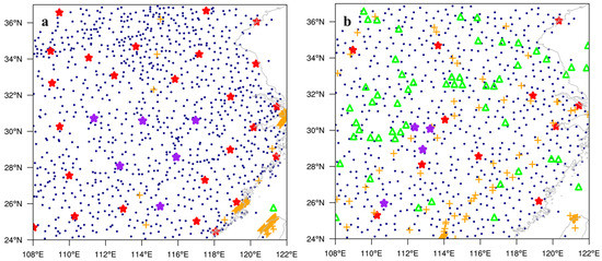 Distribution of the assimilated observations from the UDD experiment (blue dots indicate the automatic stations’ data, green triangles are the cloud-tracked wind data, orange crosses are data from aircraft reports, red pentagrams indicate operational sounding data and purple pentagrams are round-trip drifting sounding data). (a) 19 June 2018 12:00 UTC; (b) 19 June 2018 18:00 UTC.