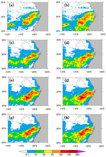 Distribution of cumulative precipitation falling in an area within 12 h (a,c,e,g) and 24 h (b,d,f,h) after 19 June 2018 18:00 UTC (in mm). (a,b) Real precipitation; (c,d) CTL experiment; (e,f) GTS experiment; (g,h) UDD experiment.
