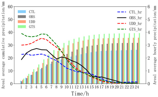 An hour-by-hour verification of the rainfall predicted by each experiment was carried out, focusing on the key areas of heavy precipitation (27–32° N, 115–120° E). The results are shown in Figure 6. The amount of precipitation in the observations showed that the main amount of heavy precipitation was concentrated in the first 12 h of the precipitation event. However, in the CTL experiment (blue dashed line), the areal average of hourly precipitation was basically weaker than the hourly rainfall (black solid line), and showed a continuous decreasing trend, failing to reflect the event of increasing rain intensity near 19 June 2018 22:00 UTC, which was not in phase with the observations. This resulted in a 24-h areal average cumulative precipitation of only 26.3 mm for the CTL experiment, in opposition to 31.8 mm in the observations. The GTS experiment (green dashed line) captured the intensification of precipitation at 19 June 2018 22:00 UTC. However, the initial moment of the GTS experiment significantly overestimated the precipitation. From 19 June 2018 18:00 UTC to 19 June 2018 22:00 UTC, the hourly precipitation in the GTS experiment showed a decreasing trend, followed by an increasing trend. However, the real precipitation during this period gradually increased. The final 24-h areal average cumulative precipitation for the GTS experiment was 39.3 mm. There were obvious empty reports compared with the real precipitation. The UDD experiment (red dashed line), based on the successful forecasting of an increase in heavy rainfall, effectively attenuated the overestimation of precipitation in the GTS experiment, with a 24-h areal average cumulative precipitation of 35.7 mm, which is relatively more similar to the observation.