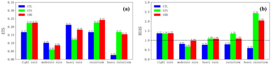 The bias scores (Figure 7b) showed that the CTL experiment under-reported all categories above light rain, indicating that the overall precipitation forecasted by this scheme was small. The UDD experiment has a score closer to 1 for moderate rain, heavy rain and rainstorms, and, to some extent, improved the problem of severe under-reporting seen in the GTS experiment for rainstorms and heavy rainstorms, and the overall forecast was relatively better.