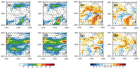 CTL experiment (a,e), UDD experiment (b,f), difference between the GTS and CTL experiments (c,g), difference between the UDD and CTL experiments (d,h) for the wind field at 850 hPa (a−d) and the 500 hPa (e−h) at 19 June 2018 18:00 UTC (shading shows the full wind speed (m/s); the vectors indicate the wind’s direction).