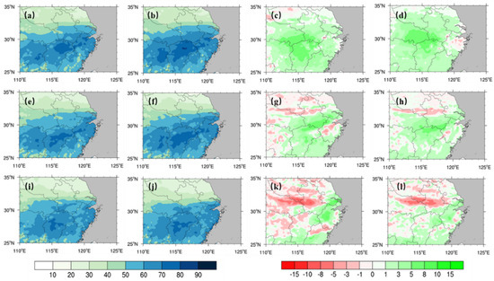 Distribution of atmospheric precipitable water (unit: mm) at 18:00 UTC on 19 June (a–d), 00:00 UTC on 20 June (e–h) and 06:00 UTC on 20 June (i–l) for the CTL experiment (a,e,i), UDD experiment (b,f,j), differences between the GTS and CTL experiment (c,g,k) and differences between the UDD and CTL experiments (d,h,l).