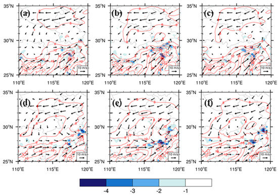 Divergence in the moisture flux at 850 hPa (shading, unit: 10−7 kg/m2·s·hPa), the moisture flux (contours, unit: g/(cm·s·hPa)) and the wind field (vectors, unit: m/s) in the CTL experiment (a,d), GTS experiment (b,e) and UDD experiment (c,f) at 19 June 2018 18:00 UTC (a–c) and 20 June 2018 00:00 UTC (d–f).