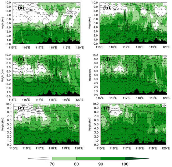 The zonal profile of potential pseudo-equivalent temperature (contours, unit: K), relative humidity (shading, unit: %) and wind (vectors, unit: m/s; the vertical velocity was multiplied by a factor of 20) predicted by the CTL experiment (a,c,e) and the UDD experiment (b,d,f) (at 27.8° N): 19 June 2018 18:00 UTC (a,b); 20 June 2018 00:00 UTC (c,d); 20 June 2018 06:00 UTC (e,f).