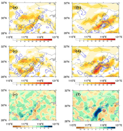 - Liu, X.; Chu, H.; Sun, J.; Zhao, W.; Meng, Q. A Numerical Simulation of the Development Process of a Mesoscale Convection Complex Causing Severe Rainstorm in the Yangtze River Delta Region behind a Northward Moving Typhoon. Atmosphere 2022, 13, 473. [Google Scholar] [CrossRef]