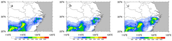 The distribution of actual cumulative precipitation and that of the experimental forecasts is shown in Figure 5. In terms of the distribution of precipitation, all three experimental scenarios simulated the general location and trend of the rainbands to some extent. The center of heavy rainfall in eastern Jiangxi was almost completely missed in the CTL experiment, and there were obvious areas with large values of spurious precipitation in northern Zhejiang (Figure 5c,d). Although the GTS experiment had a better simulation of the heavy precipitation in eastern Jiangxi compared with the CTL experiment, there were empty reports for 24 h of rainfall reaching over 200 mm in the center. For the spurious heavy precipitation in northern Zhejiang in the control experiment, instead of weakening, there was a further enhancement, with significantly more empty reports of precipitation over 50 mm in this region (Figure 5e,f). The UDD experiment was able to forecast the heavy rainfall event in eastern Jiangxi and also reduced the magnitude of precipitation compared with the GTS experiment, and weakened the spurious heavy precipitation that occurred in Zhejiang, making it relatively closer to the observations overall (Figure 5g,h).