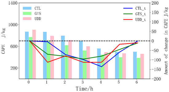 The regional average values of CAPE and their variation within the range of 26–28° N, 114–116° E are shown in Figure 14. All three experiments showed a decreasing trend in CAPE within six hours. We found that the UDD experiment had the largest CAPE at 18:00 UTC on 19 June, which reached 906.2 J/kg (pink column). In contrast, the CAPE values for the GTS experiment were significantly smaller than those of the other two experiments. The CAPE in the GTS experiment was only 771.1 J/kg at this time (green column). The GTS experiment’s overestimation of precipitation led to an early release of unstable energy, causing the GTS experiment to show a decreasing trend that was inconsistent with the increase in hourly precipitation in the observations. The CAPE of the CTL experiment was slightly less than that of the UDD experiment at 19 June 2018 18:00 UTC (blue column). However, the reduction in CAPE in the CTL experiment was only 371.4 J/kg during the enhanced phase of observation. The reduction in CAPE for the UDD experiment within the same period reached 445.3 J/kg. This suggests that the CTL experiment did not release the unstable energy sufficiently, making it underestimate the forecasted precipitation.