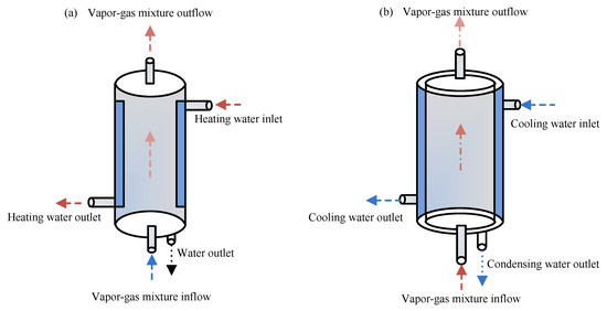 The multisection growth tube was used to construct a supersaturated environment via different supersaturation-achieving methods, as presented in Figure 2. Figure 2a shows Method 1 of a cool saturated flow meeting with a warm-walled growth tube, i.e., . For Method 1, the setting value of temperature was Tin = 298 K, Tw1 = 323 K, and Twn = 343 K. Additionally, a warm saturated flow into a cold-walled growth tube for Method 2 is presented in Figure 2b, i.e., . Correspondingly, the setting value of temperature was Tin = 343 K, Tw1 = 323 K, and Twn = 298 K for Method 2. The corresponding experiments have been carried out in some research work [16,17,21,28]. And the carrier gas of air, 100% RH air, and coal-fired flue gas were all adopted in the experiments. Meanwhile, the experimental results could verify the feasibility of two typical supersaturation-achieving methods.