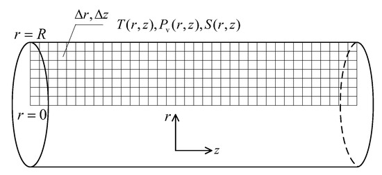 where r and z are the radial and axial coordinates, respectively; R is the tube radius, m; U is the average velocity of the gaseous mixture, m/s; and αt is the thermal diffusivity coefficient, m2/s. Analogously, the water vapor partial pressure was determined using the following equation: