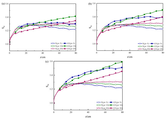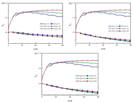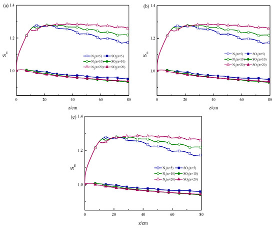 Figure 5 gives the distribution of the mean supersaturation at different radial directions in the multisection growth tube with different SO2 concentrations in the flue gas. Additionally, the condition of section number was 5, 10, and 20, with N2 as a comparison. And the content of SO2 was 0.1%, 1%, and 5% as illustrated in Figure 5a–c.