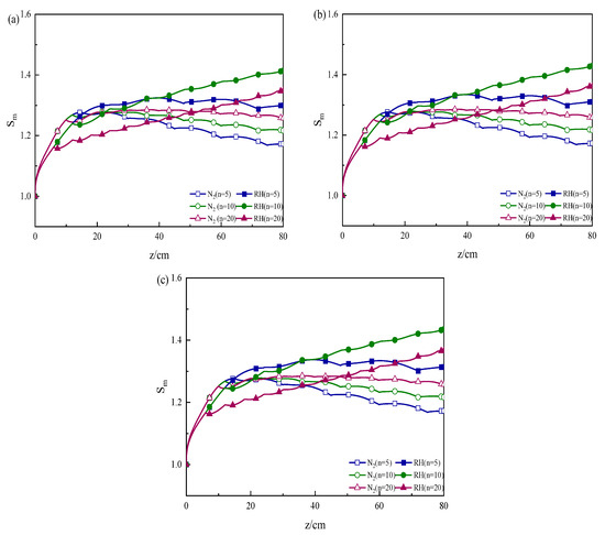 Figure 6 shows the distribution of the mean supersaturation at different radial directions in the multisection growth tube with different RH concentrations of flue gas. Additionally, the condition of section number was 5, 10, and 20, with N2 as a comparison. And the content of RH was 50%, 100%, and 120%, as reported in Figure 6a–c.