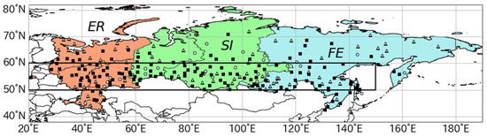 Study area and the distribution of weather stations in Russia. The circles represent the stations at which only temperature-related indexes were calculated, while the triangles represent the stations at which only precipitation-related indexes were calculated. Squares represent the stations at which all indexes were calculated. The colors indicate the three regions of Russia: European Russia (ER; red), Siberia (SI; green), and the Far East (FE; blue). The thick rectangle denotes the range of observation stations used in this study.