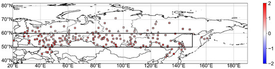 Figure 1 shows the trend in the occurrence of extreme events around the southern part of Siberia, which this study defined as the region located to the south of 60° N in Siberia, the Ural district in Russia, and neighboring regions. Extreme events related to high temperatures are increasing everywhere. Precipitation extremes are also increasing in many regions but are decreasing only in southwestern Siberia (60–85° E and 50–65° N) [11]. The previous study [11] used data from 26 sites from 1969 to 2011 and calculated 10 extreme climate indexes which were used to evaluate temperature and precipitation extremes [12] (see Section 2). In this region, extreme climate indexes for precipitation averaged over the entire region are decreasing. However, the numbers of sites showing increasing and decreasing trends in heavy rainfall events are comparable. Moreover, only a few sites show statistically significant trends.