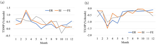 Monthly averaged trends of (a) TX90P (%/decade) and (b) TX10P (%/decade) in 3 regions in 1950–2019. ER: European Russia; SI: Siberia; FE: the Far East.