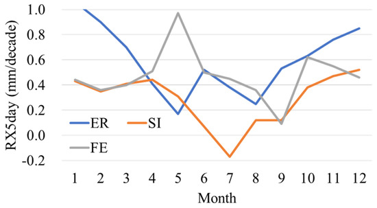 Monthly average trend of RX5day (mm/decade) in 3 regions in 1950–2019. ER: European Russia; SI: Siberia; FE: the Far East.