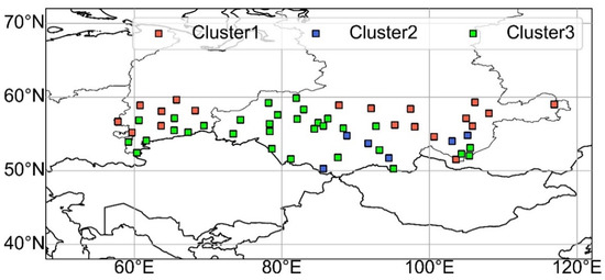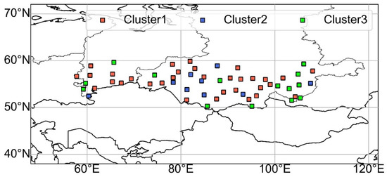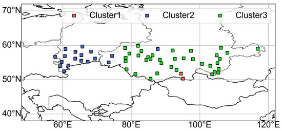Figure 8 illustrates the spatial distribution of clusters based on monthly TX10P trends. The distribution of TX90P varied in the longitudinal direction (Figure 6), whereas the distribution of TX10P, especially Clusters 1 and 3, varied mainly in the latitudinal direction (Figure 8). Stations belonging to Cluster 1 were located separately in the Ural Federal District and east of the Siberia Federal District. The stations included in Cluster 3 were distributed throughout the Siberian region, especially at approximately 80° E.