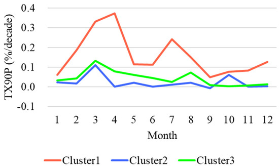 Monthly averaged trends of TX90P by each cluster.
