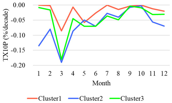 The stations in Cluster 2 were fewer and more sparsely located than in the other clusters; however, they tended to be higher in elevation than observations in the other clusters. The monthly average trend calculated for each cluster indicated that the frequency of low-temperature events decreased significantly in spring for all clusters (Figure 9). Cluster 1, which contained stations further north, had a smaller decreasing trend in almost all months than the other clusters. Although Clusters 2 and 3 showed similar monthly trends, Cluster 2 showed a strong downward trend during winter.