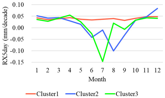The results of clustering by monthly RX5DAY trends showed that all clusters were sparsely distributed compared with the results of the two indexes described above (Figure 10). Comparing the number of stations in each cluster, Cluster 1 had the largest number of stations, and they were distributed throughout Siberia. The results of the monthly average trend of RX5DAY for each cluster indicated that the trend differed substantially between Cluster 1 and the other clusters (Figure 11). Cluster 1 showed a stable and increasing trend in precipitation throughout the year. In contrast, Clusters 2 and 3 showed strong decreasing trends in precipitation during summer, although it increased in all other seasons.